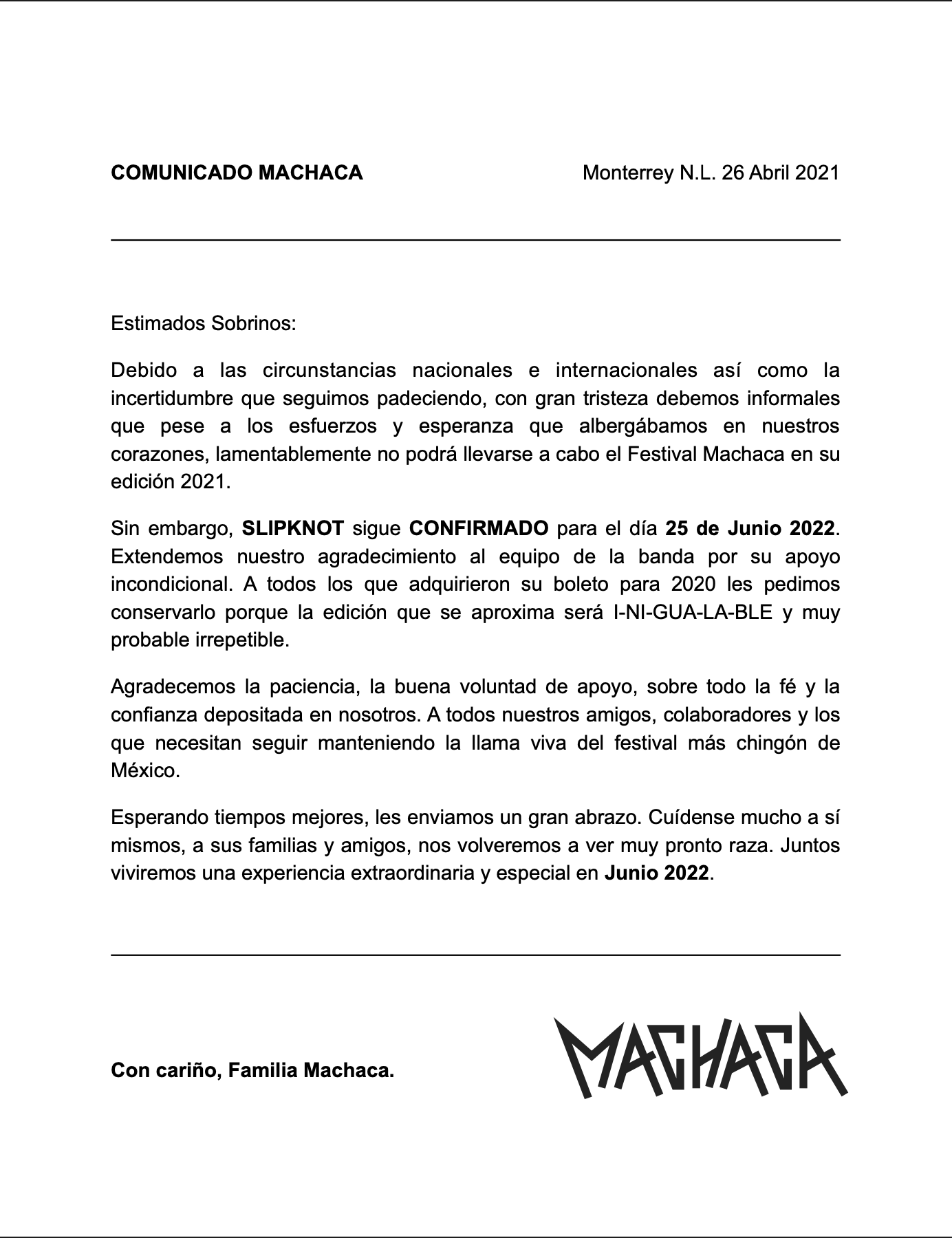 25 de junio de 2022 en el imponente Parque Fundidora de Monterrey Nuevo León. CIUDAD DE MÉXICO abril 12 EL UNIVERSAL- Monterrey Nuevo León se prepara para reanudar la fiesta que hace dos años se quedó en pausa debido a la pandemia con el regreso del festival Machaca el 25 de junio en el Parque Fundidora cuyo cartel sigue encabezado por la banda de metal Slipknot que se mantuvo firme en formar parte de esta celebración en la.